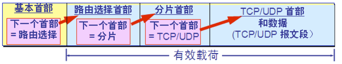 六种扩展首部 1.逐跳选项 2.路由选择 3.分片 4.鉴别 5.封装安全有效载荷 6.目的站选项