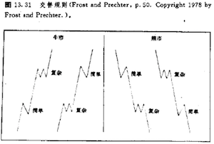 交替规则:从较为广义的角度来看,交替规则(或原理)认为,市场通常不会接连地以同样的方式演变。如果上一次的顶部或底部是这个样子,那么下一回很可能就是另一个样子了。交替规则并不能确切地说明下面出场的是什么,但它可以说明什么可能是不会出现的。
