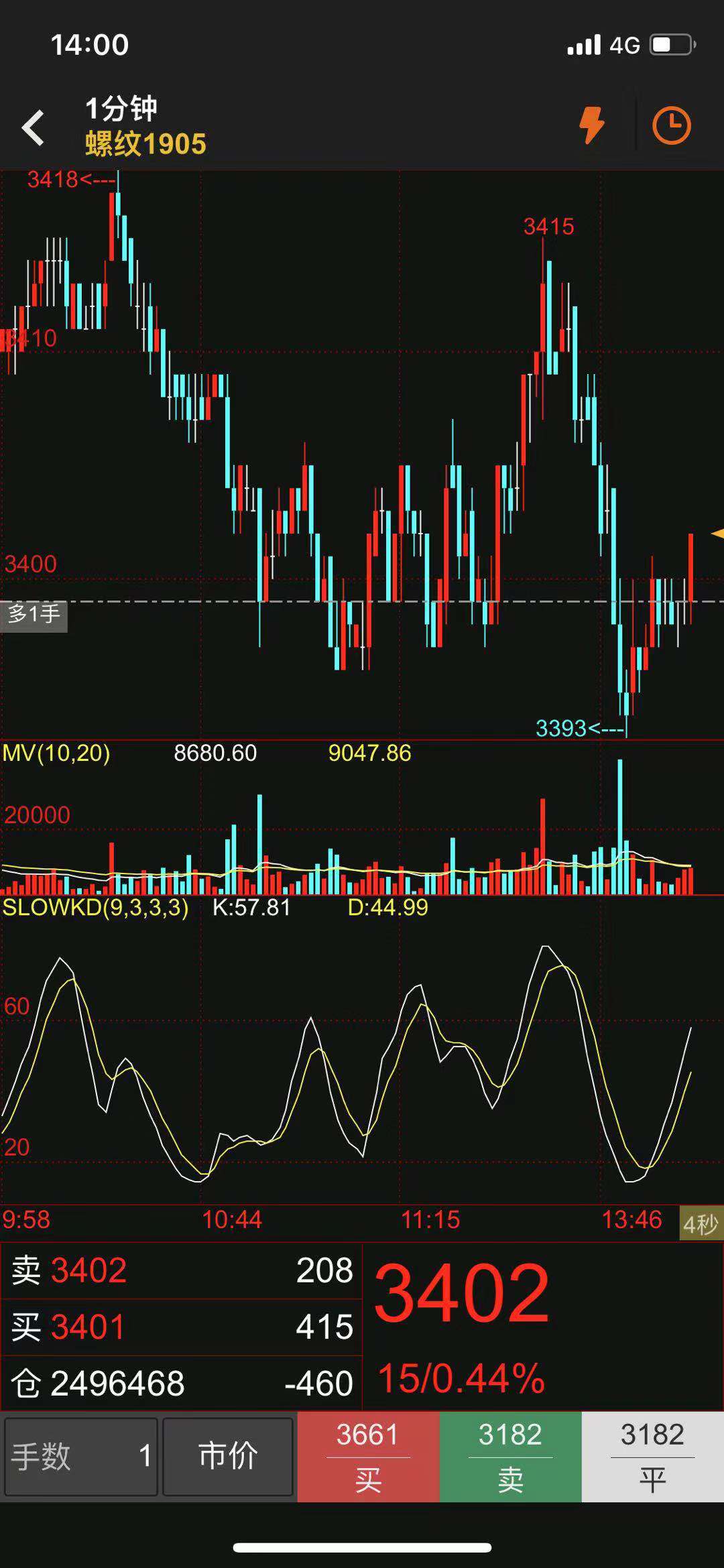螺纹1905 买1手 买入价3399 卖出价3400